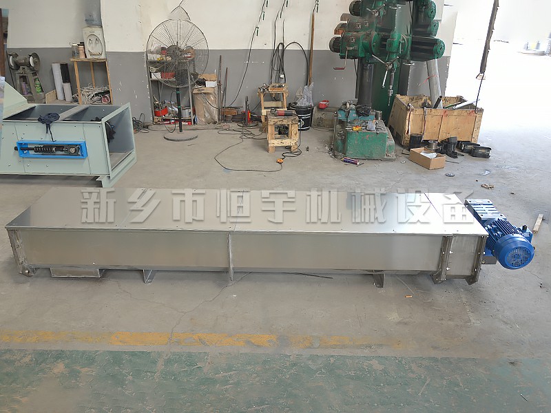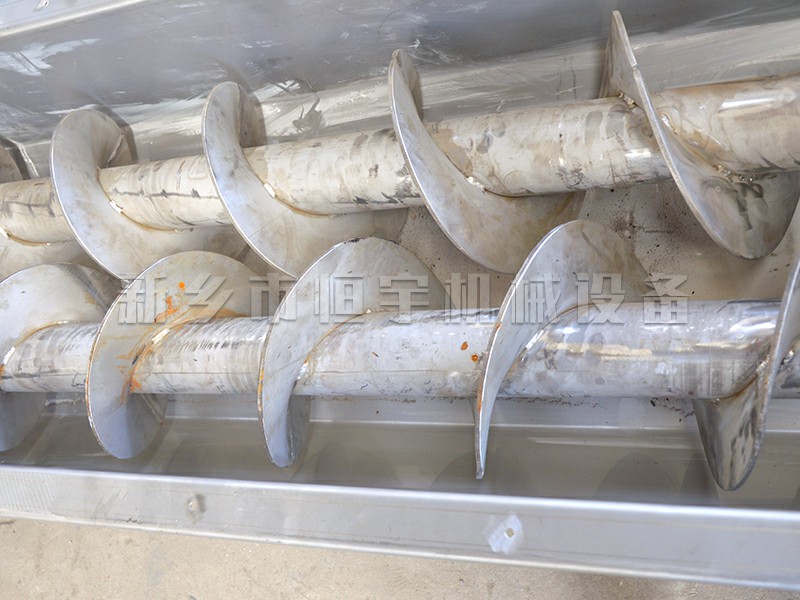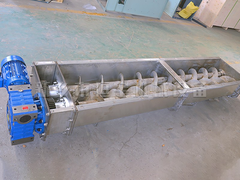 螺旋输送机的工作原理是旋转的螺旋叶片将物料在槽或管中推移而得到输送物料的目的,散料在自重和机壳的摩擦力作用下堆积在槽的下部,不随叶片旋转而被叶片推动前进。螺旋输送机旋转轴上焊的螺旋叶片,叶片的面型根据输送物料的不同有实体面型、带式面型、叶片面型等型式。螺旋输送机的螺旋轴在物料运动方向的终端有止推轴承以随物料给螺旋的轴向反力,在机长较长时,应加中间吊挂轴承。
